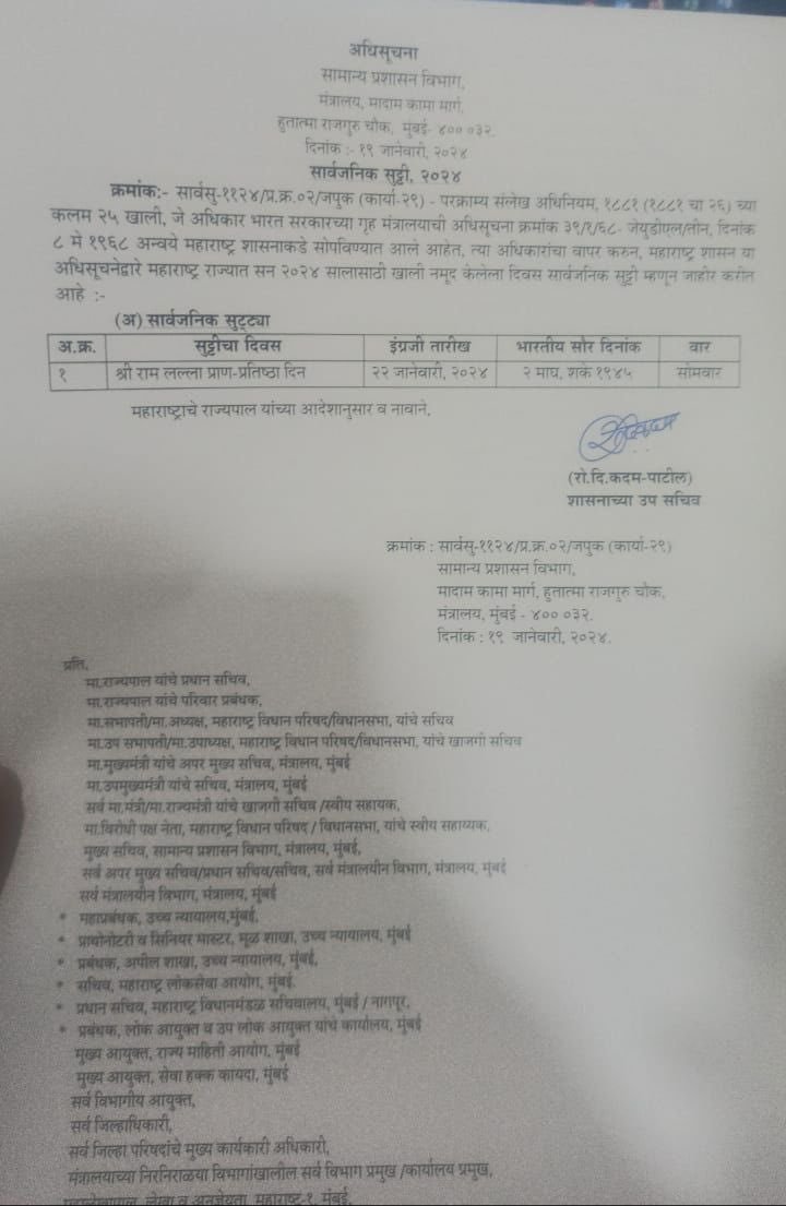 DeshGujarat on X: “Public holiday declared on 22nd January in